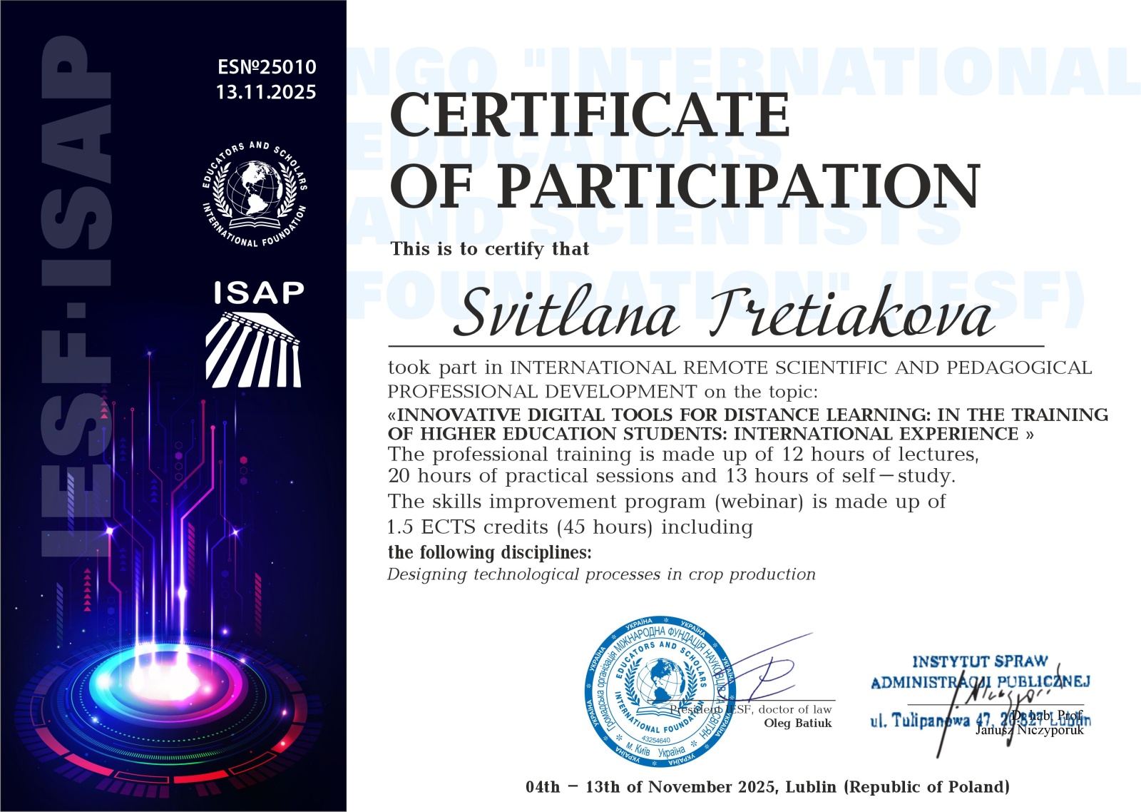 Отримані знання та практичні навички сприятимуть подальшому вдосконаленню навчальних курсів, розробці сучасних освітніх матеріалів та ефективному застосуванню цифрових технологій у підготовці фахівців-аграріїв.