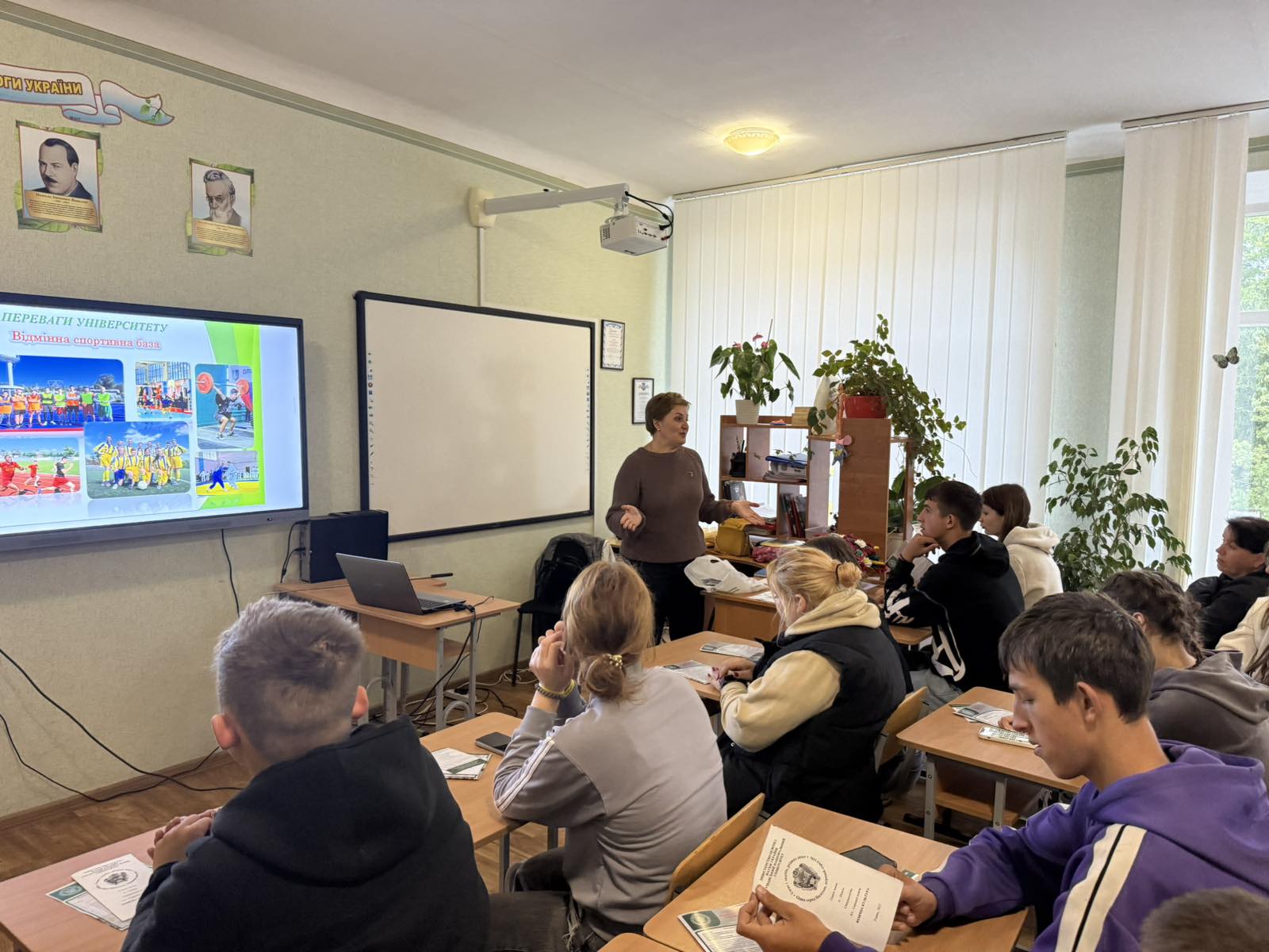 У межах зустрічі доцент кафедри рослинництва Леся Вишневська презентувала освітні програми університету та ознайомила студентів із можливостями здобуття вищої освіти за аграрними спеціальностями. Завідувач кафедри фізичного виховання та психолого-педагогічних дисциплін Юрій Мороз висвітлив особливості підготовки майбутніх учителів фізичної культури, акцентувавши увагу на сучасних підходах до розвитку спорту та формування здорового способу життя.