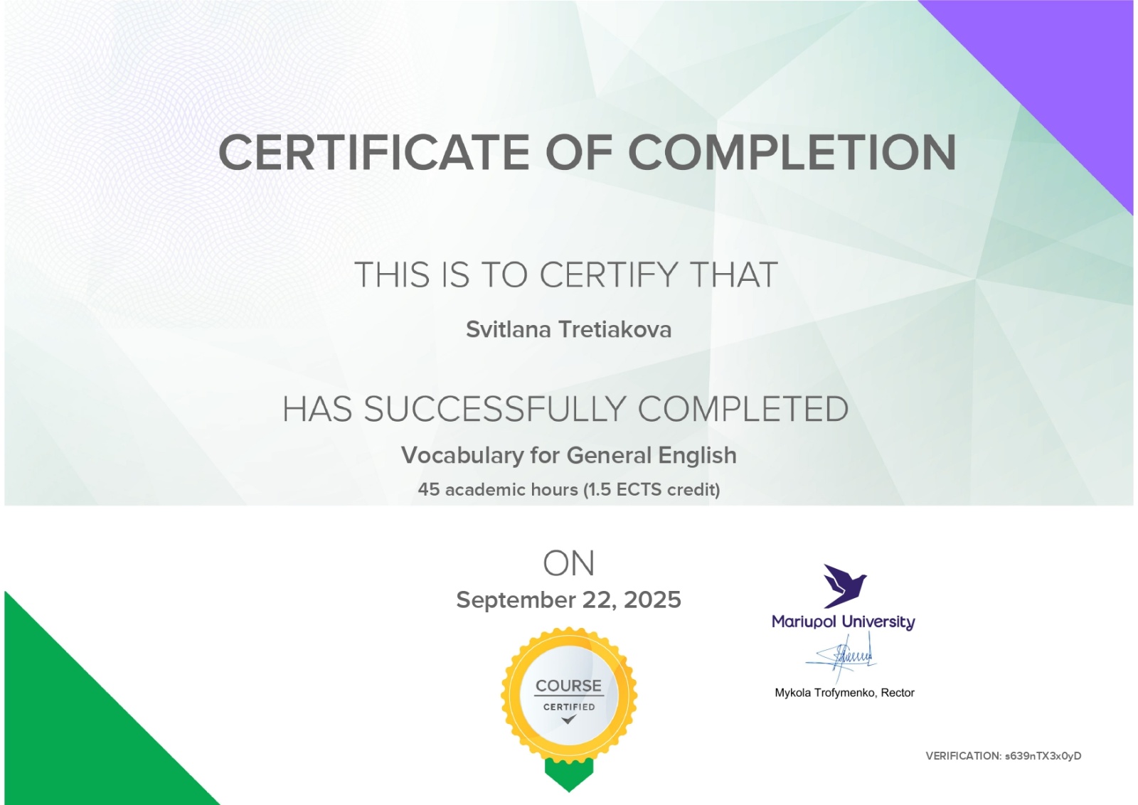 22 вересня 2025 року доцентка кафедри рослинництва Уманського національного університету Світлана ТРЕТЬЯКОВА успішно завершила навчання за програмою VOCABULARY WordMine 2 (A1–C1 400 слів). Це сучасний курс, спрямований на ефективне та системне розширення словникового запасу англійської мови. Програма курсу охоплювала широку загальну лексику, включаючи слова та вирази, необхідні як у повсякденному спілкуванні, так і в академічному та професійному середовищі.